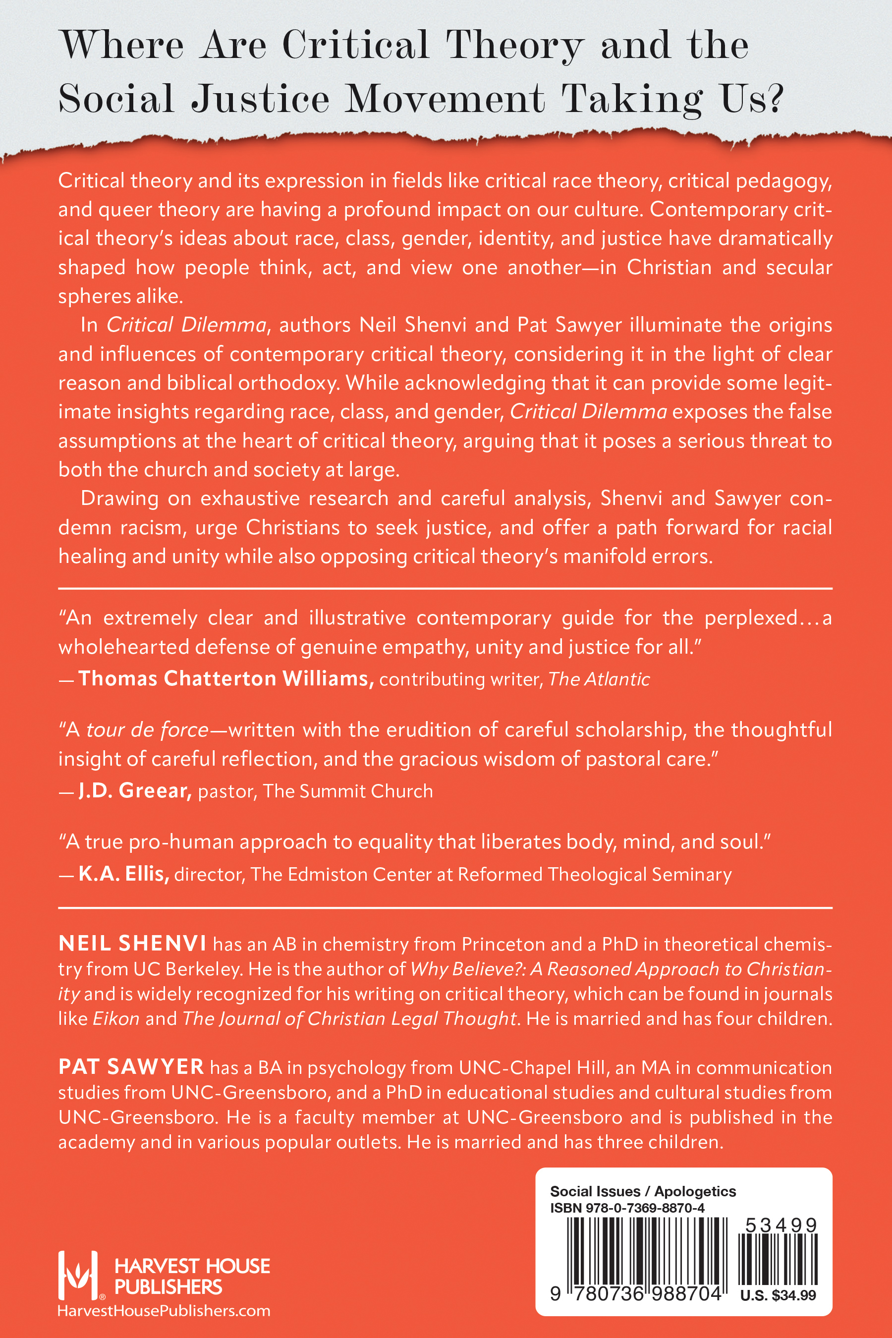 In Critical Dilemma, authors Neil Shenvi and Pat Sawyer illuminate the origins and influences of contemporary critical theory, considering it in the light of clear reason and biblical orthodoxy. While acknowledging that it can provide some legitimate insights regarding race, class, and gender, Critical Dilemma exposes the false assumptions at the heart of critical theory, arguing that it poses a serious threat to both the church and society at large.