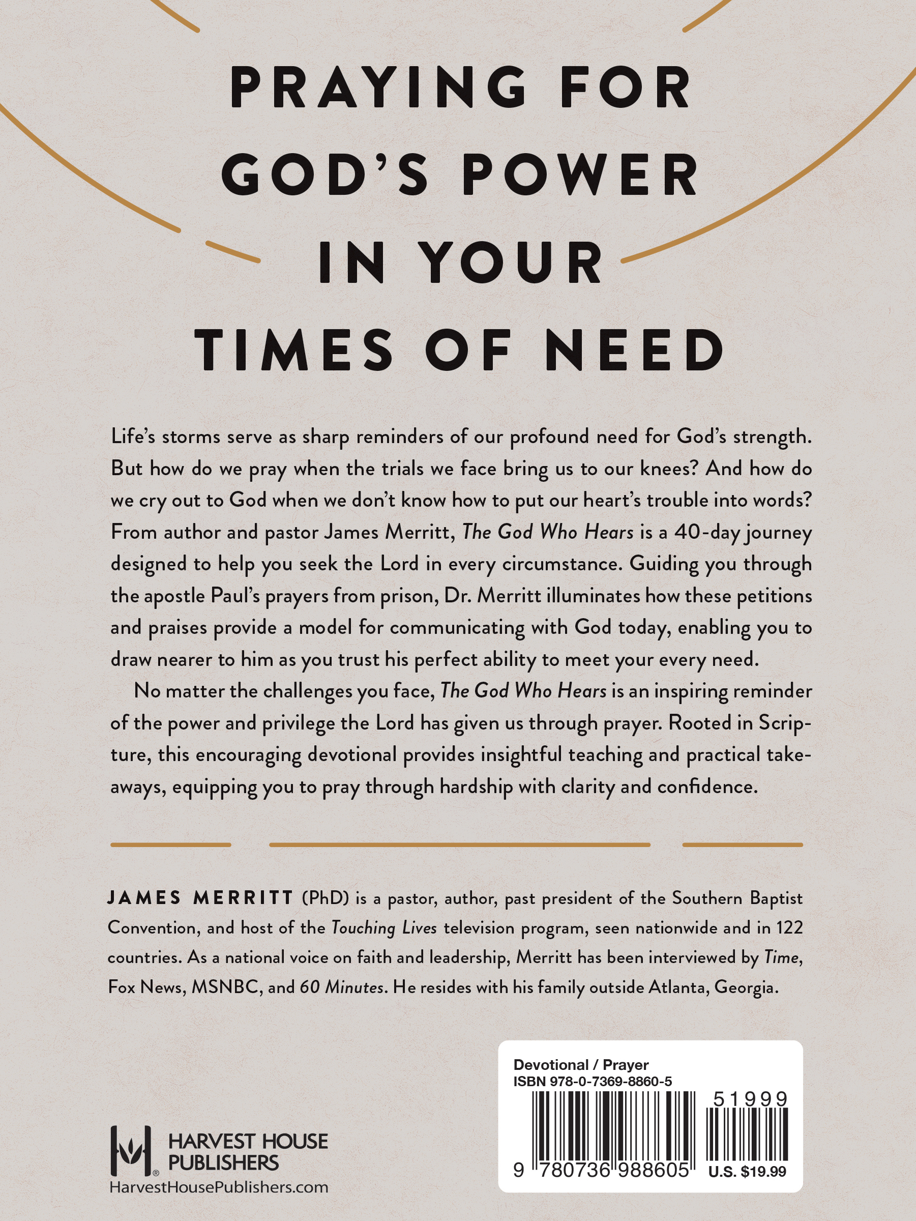 From author and pastor James Merritt, The God Who Hears is a 40-day journey designed to help you seek the Lord in every circumstance. Guiding you through the apostle Paul’s prayers from prison, Dr. Merritt illuminates how these petitions and praises provide a model for communicating with God today, enabling you to draw nearer to him as you trust his perfect ability to meet your every need.