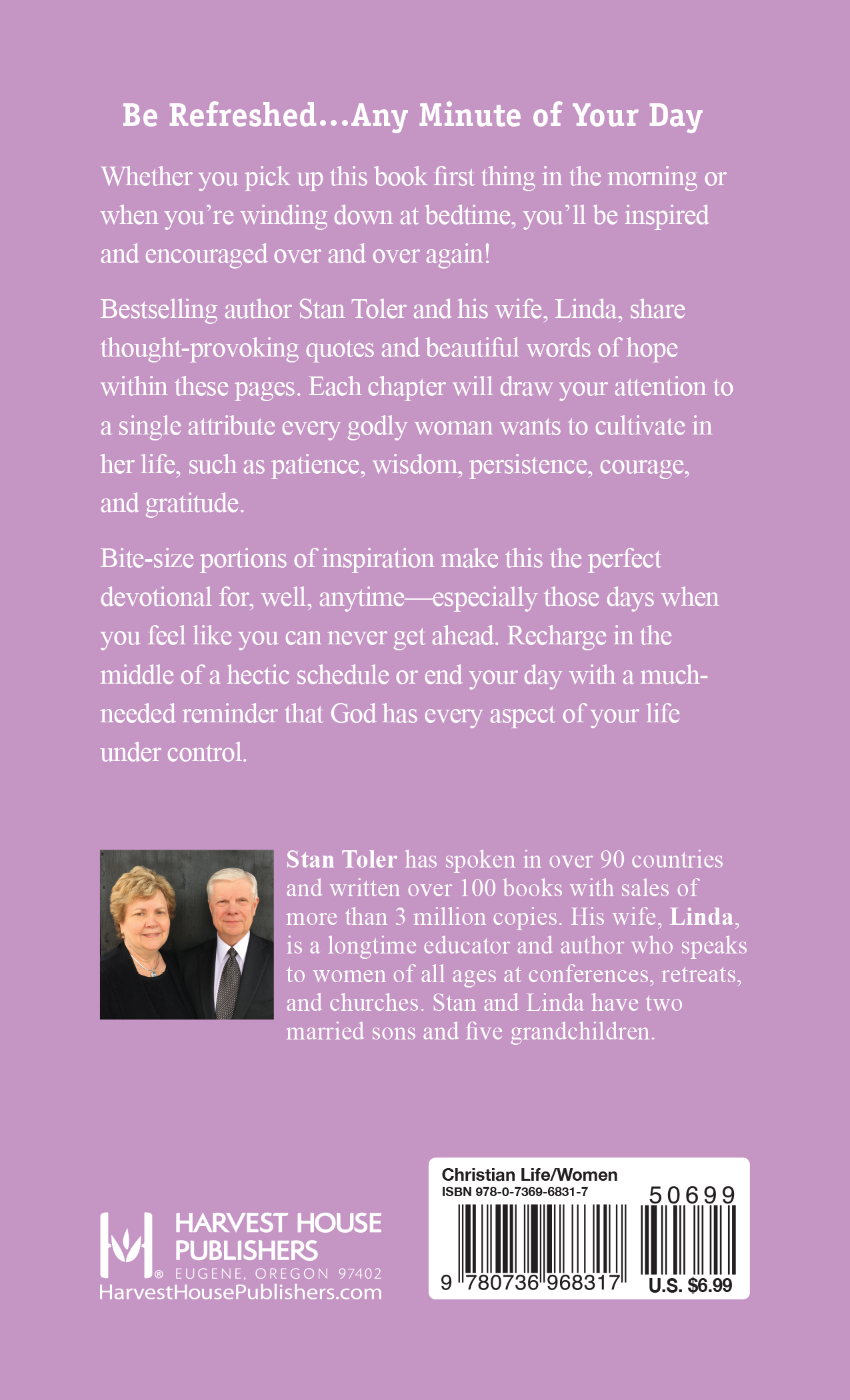 Bestselling author Stan Toler and his wife, Linda, share thought-provoking quotes and beautiful words of hope within these pages. Each chapter will draw your attention to a single attribute every godly woman wants to cultivate in her life, such as patience, wisdom, persistence, courage, and gratitude.