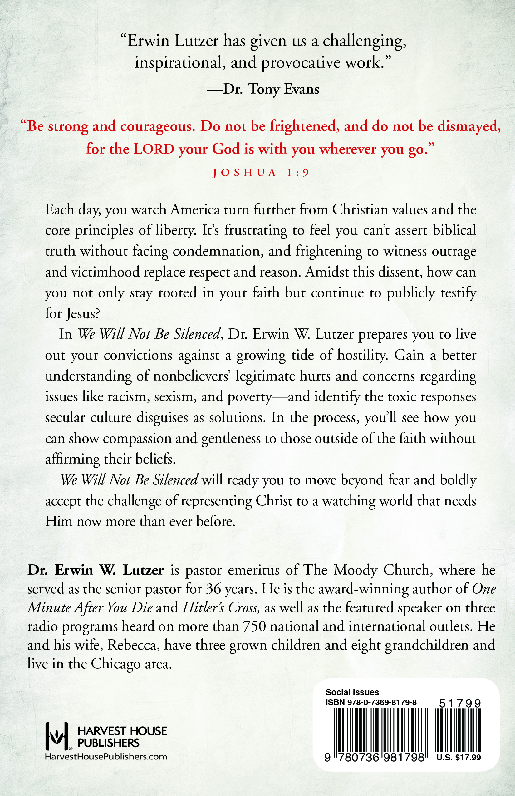 In We Will Not Be Silenced, Dr. Erwin W. Lutzer prepares you to live out your convictions against a growing tide of hostility. Gain a better understanding of nonbelievers’ legitimate hurts and concerns regarding issues like racism, sexism, and poverty—and identify the toxic responses secular culture disguises as solutions. In the process, you’ll see how you can show compassion and gentleness to those outside of the faith without affirming their beliefs.